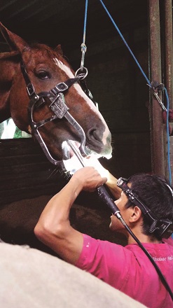 - この写真は馬の歯医者さんです。すごく珍しい仕事です。馬の歯は生涯生え続けます。だから年に一度削ってあげなくてはいけません。私たちが、歯医者さんをちょっぴり怖いのと同じで、馬達も歯医者さんの事を少し怖がります!だから馬の歯医者さんは命がけだしすごく力が必要な仕事です。馬達がご飯をおいしく食べて、健康でいられるためにも、頑張れ馬の歯医者さん!!