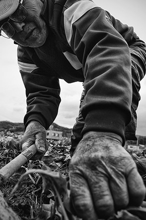 - これは、おじさんがほうれん草を刈っているところの写真です。「雨が降ったら一気に伸びるから、早く刈らあかんねん」と忙しそうに、豪快な手つきで刈っていました。力強い手と顔を見せるためにローアングルから撮りました。ノーファインダーで撮りましたが、しっかりピントが来て良かったです。