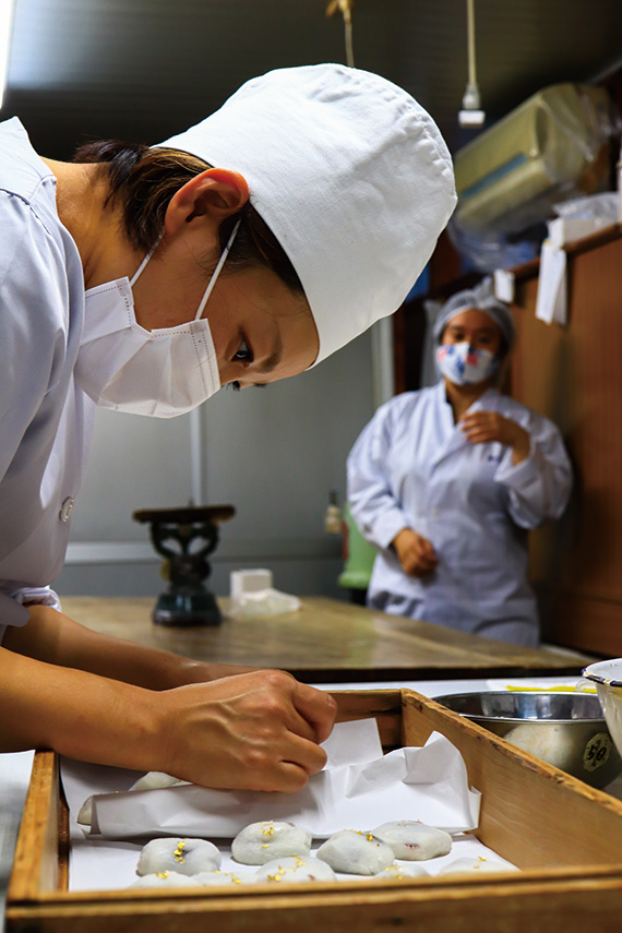 - この写真は学校の近くにある商店街にある和菓子屋さんで撮影した写真です。この女性が真剣にお菓子を作っている姿を脇役も入れながら撮影しました。また、ここで店主の方からこんな機械で餡子を練るということや、こんな道具で形をとっているなど、お菓子作りについて詳しく説明をしていただきながら撮影させていただきました。